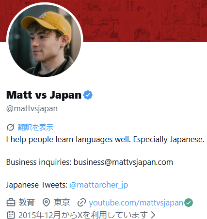 現在の拠点については、X(@mattvsjapan)のプロフィールに東京のピンが立っており、東京在住であることが確認できます。