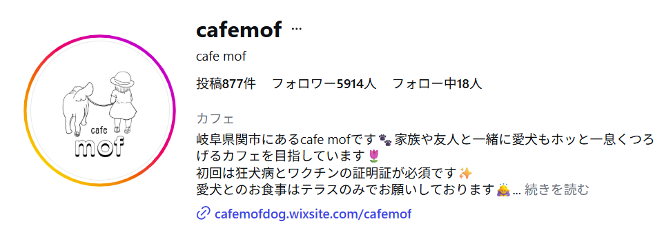 もちごめ兄弟のInstagramに、「#cafemof もちごめがほぼ毎日お世話になっているドッグランです」というキャプションとともに投稿がされており、このcafe mofの所在地が岐阜県関市武芸川町高野218-4と確認できます。