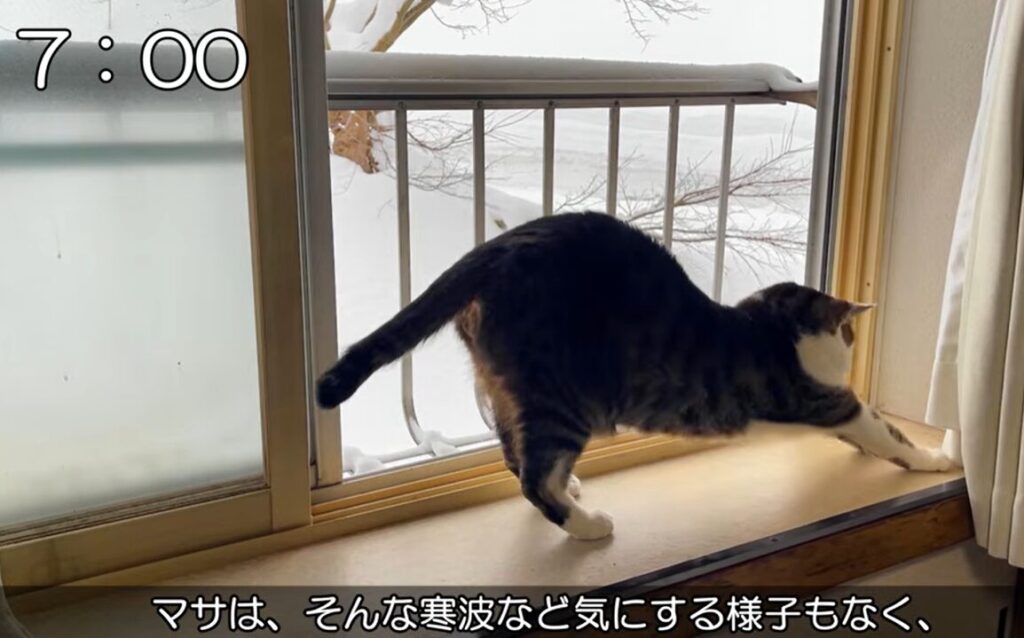 飼い主さんがドリルを回そうが、雪が積もろうが、マサはどこでも堂々とくつろいでいます。