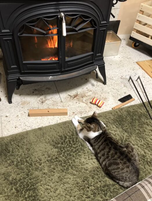 マサのために制作したアイテムを挙げると、オーダーメイドの猫用ケージ・壁を縦横に走るキャットウォーク・キッチン棚に組み込んだキャットステップ・冬の寒さと脱走を防ぐ玄関の内扉・薪ストーブ前専用のハンモックと、数え上げればきりがありません。